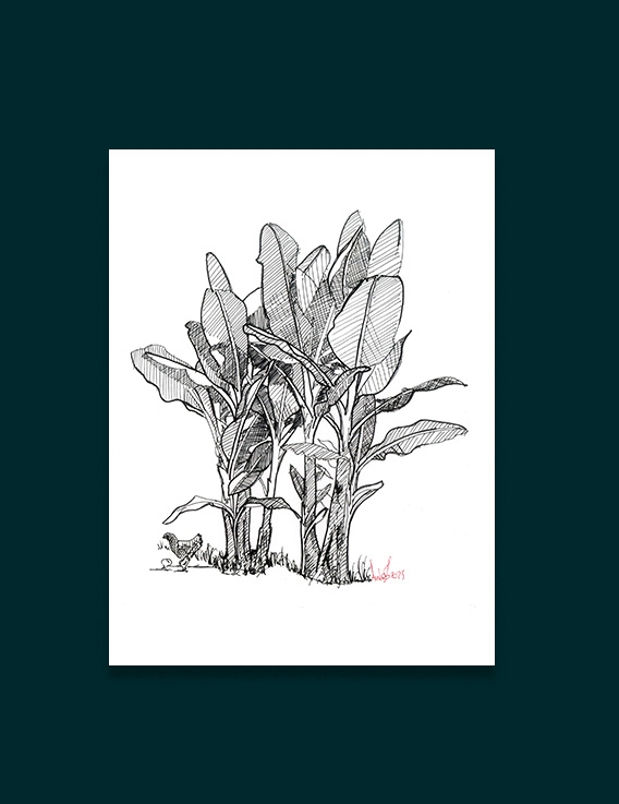 « Les bananiers envahissent jardins, champs et cours en Guadeloupe, si constants qu'on ne les voit plus jusqu'à ce qu'on les isole graphiquement. Ils bordent nos routes vers le marché maintenant, nourrissant le quotidien créole sans effort apparent. Dans le dessin, leurs silhouettes nues révèlent une force structurelle brute. "Bannann jonn pa ka vini vèt" (les bananes jaunes ne reverdissent pas – une fois mûres, pas de retour en arrière). Pour moi, c'est ce décor nourricier ancré qui traverse le temps sans changer. »