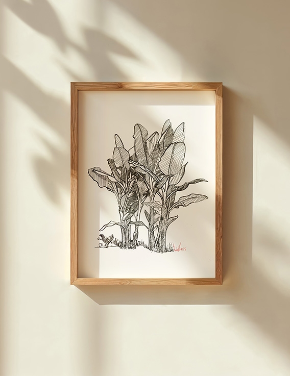 Dans cette œuvre, Awoz choisit un motif qu’on croit connaître par cœur : les bananiers, partout dans les champs, les cours et au bord des routes. En les isolant, il en révèle la structure brute, presque sculpturale. La poule qui se promène au pied des troncs ramène l’image au quotidien — une présence familière, tranquille, qui raconte la vie telle qu’elle se déroule vraiment. Cette édition numérotée trouve facilement sa place dans un intérieur qui aime l’illustration des Antilles, les scènes de vie créoles, et les œuvres qui parlent sans forcer.