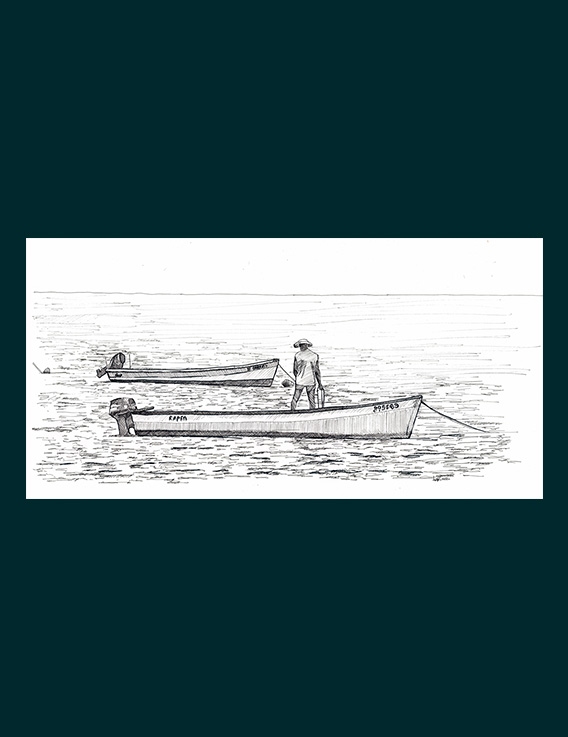 « Le pêcheur serein sur sa barque, posture assurée face à l'horizon – ataraxie, paix intérieure océanique pure. Transmise aux gosses lors de sorties mer actuelles. "Anba latè, pa ni plézi" (sous terre, pas de plaisir – profite la surface vivante). Connexion profonde à la mer immense. Quiétude partagée intemporellement. »