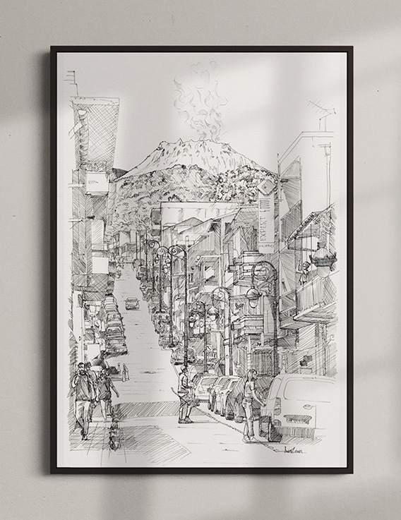 Dans ce dessin, Awoz fait surgir un contraste typiquement basseterrois : la rue et ses rythmes urbains, puis, au loin, la Soufrière qui s’impose sans jamais devenir un simple décor. La scène se lit comme un lien direct entre quotidien et territoire : marcher en ville avec, en fond, cette masse vivante qui rappelle la géologie de l’île. Le trait réaliste, fin et précis, rend la perspective et la profondeur, et laisse l’atmosphère s’installer — une Guadeloupe “dans les tripes”, où le minéral et l’humain se mêlent.