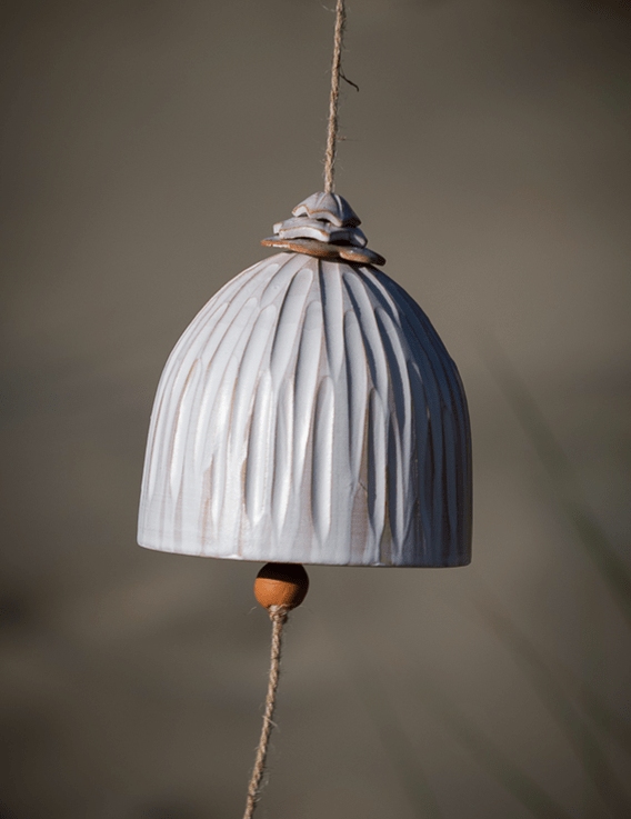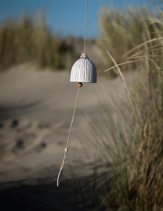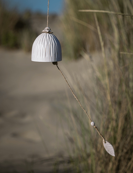 Objets du vent. Mouvements figés dans la terre. La cloche en céramique Vent des Alizés est une création singulière, façonnée à la main en Martinique par la céramiste Catherine Bland. Elle évoque le murmure des alizés, ces vents tièdes qui glissent sur les reliefs tropicaux et imprègnent l’air d’une douceur constante.
