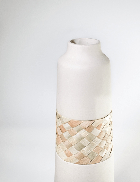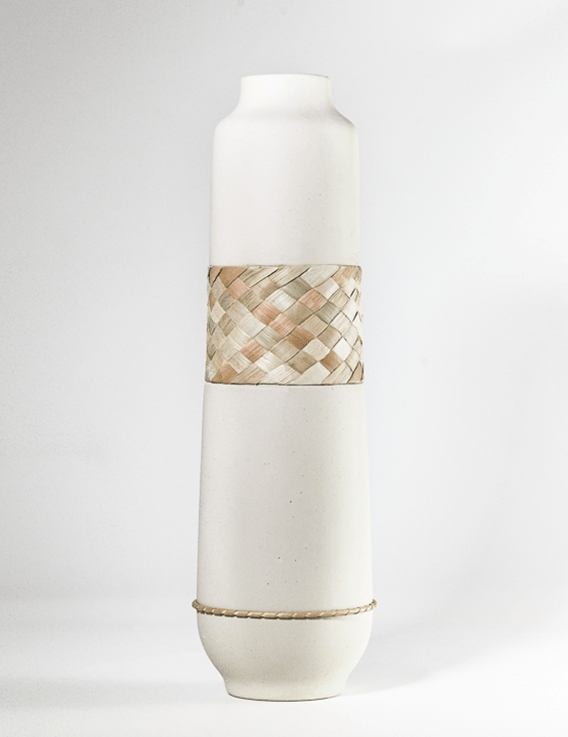 Cette pièce de design créole et d'artisanat d'art se compose d'un vase en céramique fabriqué en atelier sur l'île de Marie-Galante. Il est orné de vannerie traditionnelle créole suivant la technique du bacoua, confectionnée par un collectif d'artisans de Guadeloupe.