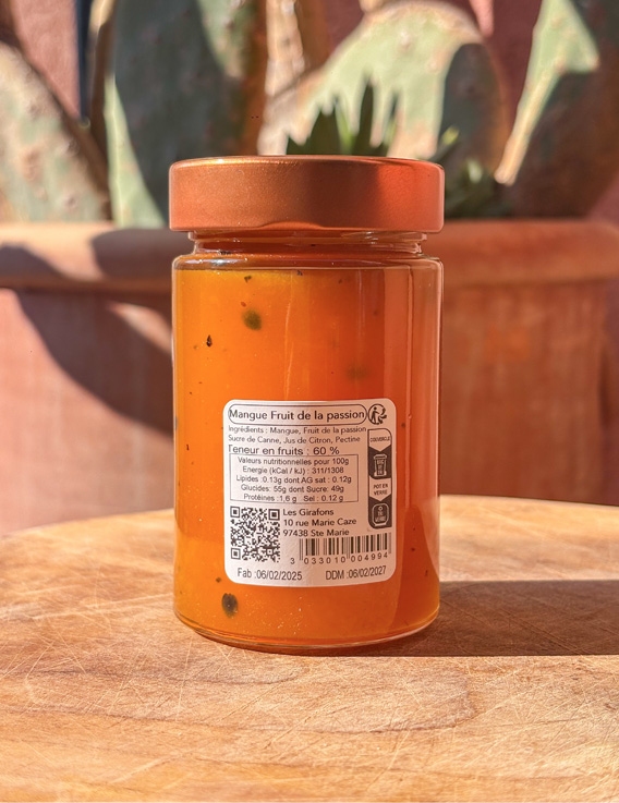 Ingrédients : Mangue, Fruit de la passion, sucre de canne, jus de citron, pectine.