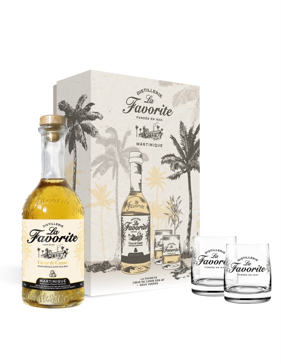 Une bouteille 70 cl du rhum ambré Cœur de Canne (45°) et deux verres 6 cl sérigraphiés La Favorite, conçus pour la dégustation. On déballe, on sert, on savoure.